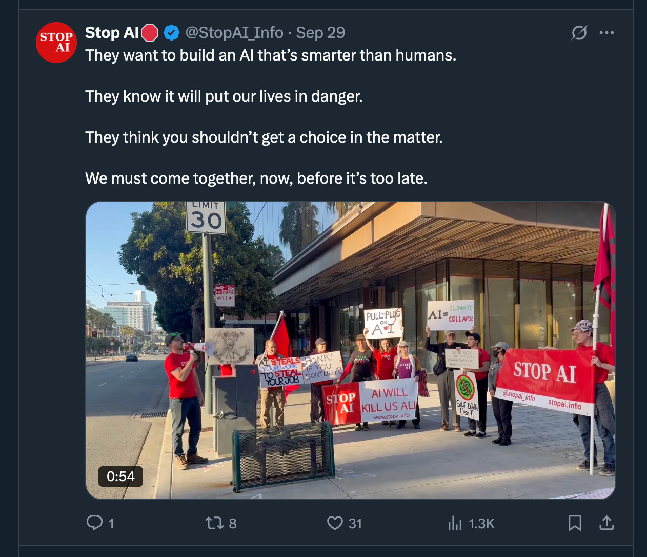 You see it now via newly-emerging activist groups such as Stop AI. Groups such as this one are just the start; we’re going to see a febrile mass-movement pushback against AI and its economic and cultural implications: