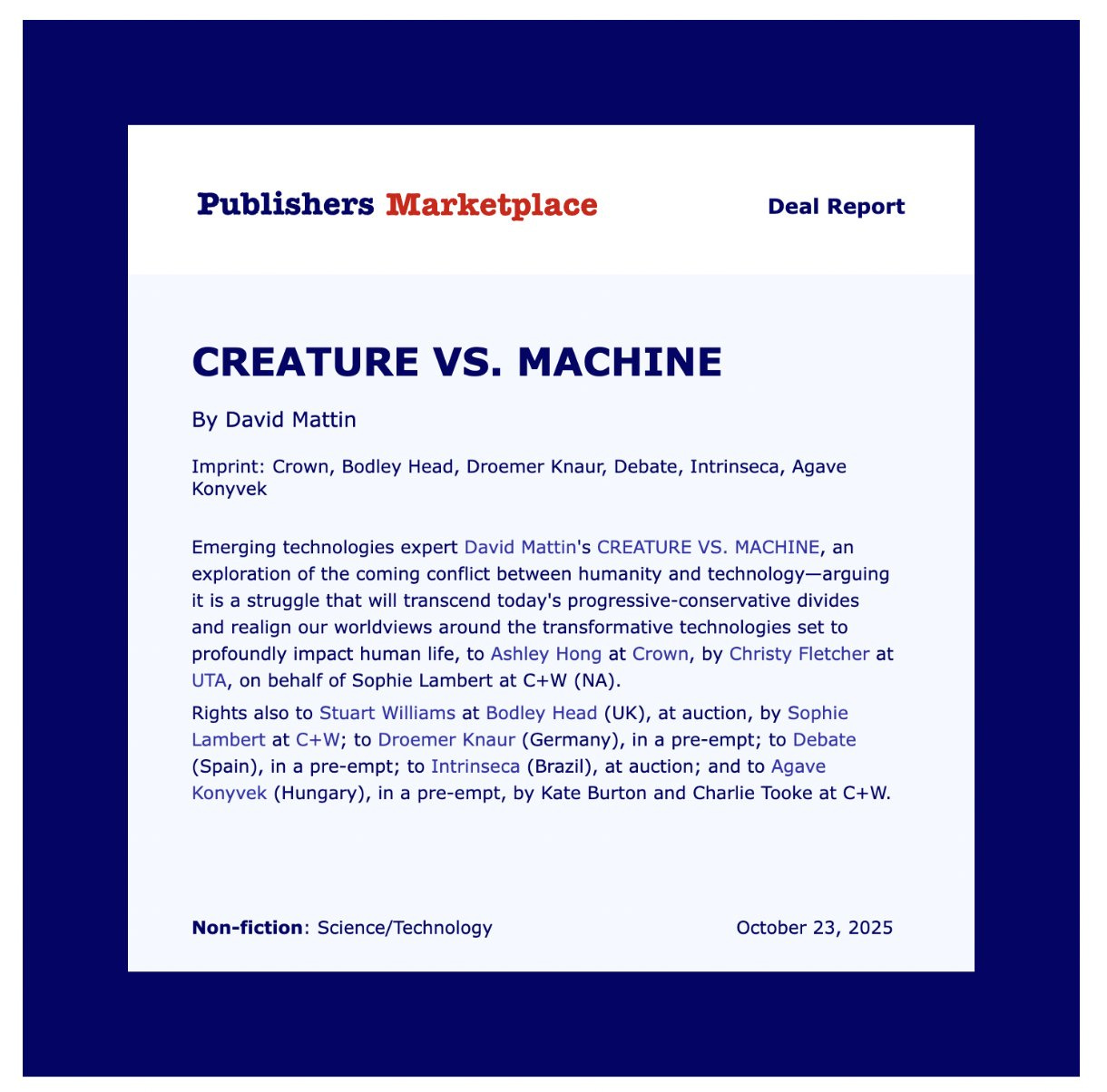 The book has sold to The Bodley Head in the UK, and Crown in the US. Both are part of Penguin Random House, and both veritable non-fiction titans that brought us such recent delights as The Coming Wave, by Mustafa Suleyman and Michael Bhaskar, Technofeudalism, by Yanis Varoufakis, and On Tyranny by Timothy Snyder, among many others. There are also translation deals in place with equally brilliant publishers in the Netherlands, Hungary, Spain, Germany, Italy, and Brazil.