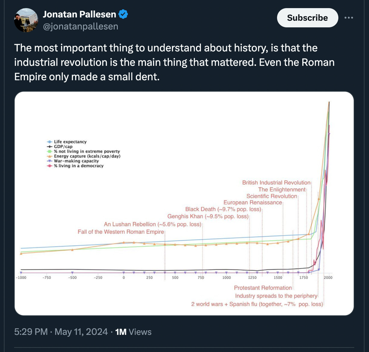 💥 This tweet captures the incredible liftoff — in everything from life expectancy to GDP to energy capture — that began with the Industrial Revolution.