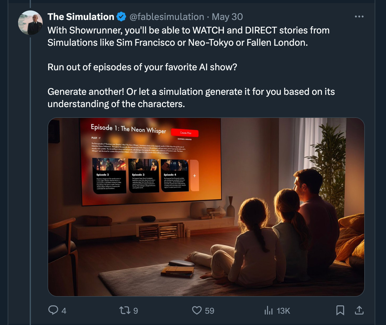 Eventually, says Fable, the Showrunner platform will function as an ‘AI Netflix’: instead of choosing a show to watch, simply describe the show you’d like to watch and the Showrunner simulation platform will generate it for you.
