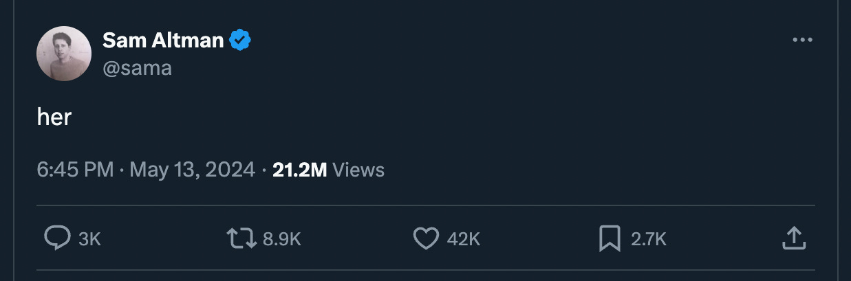 That’s a reference, of course, to the AI-fuelled virtual companion in the 2013 film Her. Altman is making a play for that kind of product: and he wants his to be the One Companion to Rule Them All.
