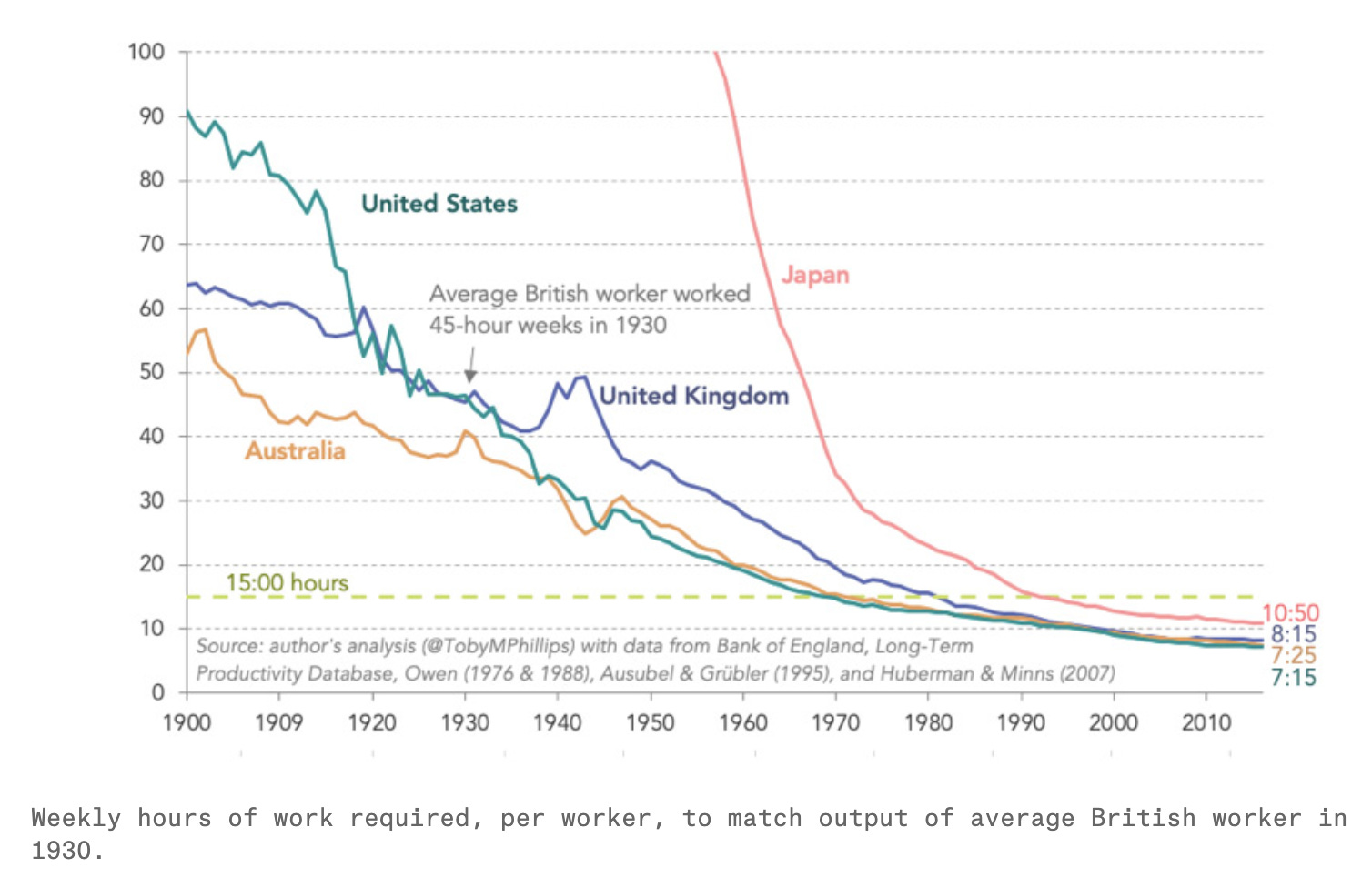 ⚡ NWSH Take: Keynes famously speculated that the inhabitants of the 21st-century would enjoy days filled with leisure, while machines did all the work. In recent years people have asked: why didn’t that come true? // Look closer, and Keynes wasn’t as wrong as we think. As Matt Ridley points out in his new book How Innovation Works, we do spend a far greater proportion of our lives in leisure activities than our grandparents did. // A four-day work week makes sense; Microsoft saw productivity jump by 40% when they trialled it in Japan last year. Time for you to experiment? // Longer-term the real shift will be a redefinition of work towards new domains of human life: care, connection, inspiration, and simply being there for one another.