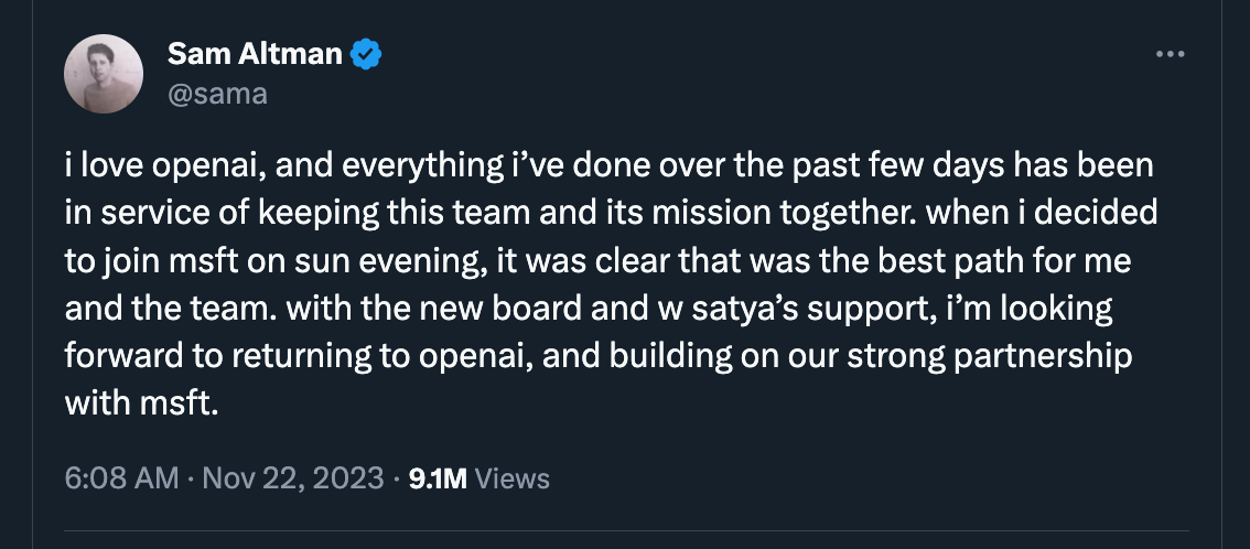 But each month I’ll throw out a thought starter to get us talking. This morning came news that Sam Altman is back as CEO of OpenAI: